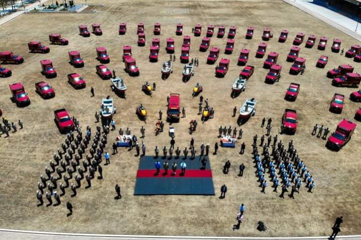 Se trata de 55 ambulancias, 18 vehículos doble cabina, nueve motocicletas- entre la cuales hay motos acuáticas- lanchas, equipo de respiración, mangueras, trocos, aparatos de asistencia para primeros auxilios, sistema de comunicaciones, uniformes y equipo contra incendios, entre otros.
