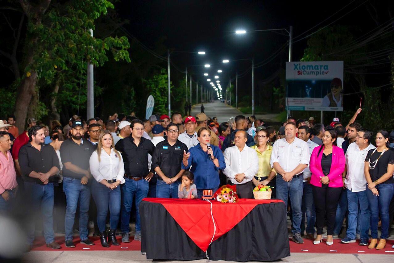 La presidenta Xiomara Castro inauguró este jueves por la noche cuatro tramos carreteros pavimentados con cemento hidráulico y seis proyectos de iluminación en comunidades de los municipios de Juticalpa, San Francisco de la Paz y Concordia, en el departamento de Olancho.