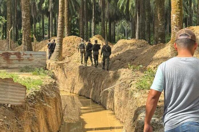 En campo se verificó la excavación de un canal de aproximadamente 3 metros de ancho por 4 de profundidad, supuestamente para evitar el paso de ganado hacia plantaciones de palma africana en expansión.