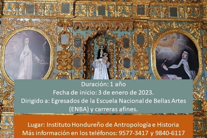 El Instituto Hondureño de Antropología e Historia (IHAH) giró convocatoria para el curso sobre conservación y restauración de bienes culturales muebles que centrará su accionar en las áreas de escultura, pintura, papel y cerámica, mismo que será financiado con fondos nacionales del Gobierno de la República está dirigido a egresados de la Escuela Nacional de Bellas Artes y otros de carreras afines.