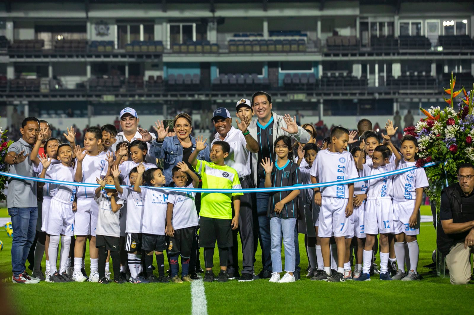 La primera mujer presidenta en la historia del país cortó la cinta a las 18:45 para dar por inaugurada la grama híbrida que tuvo un costo de 32.4 millones de lempiras.