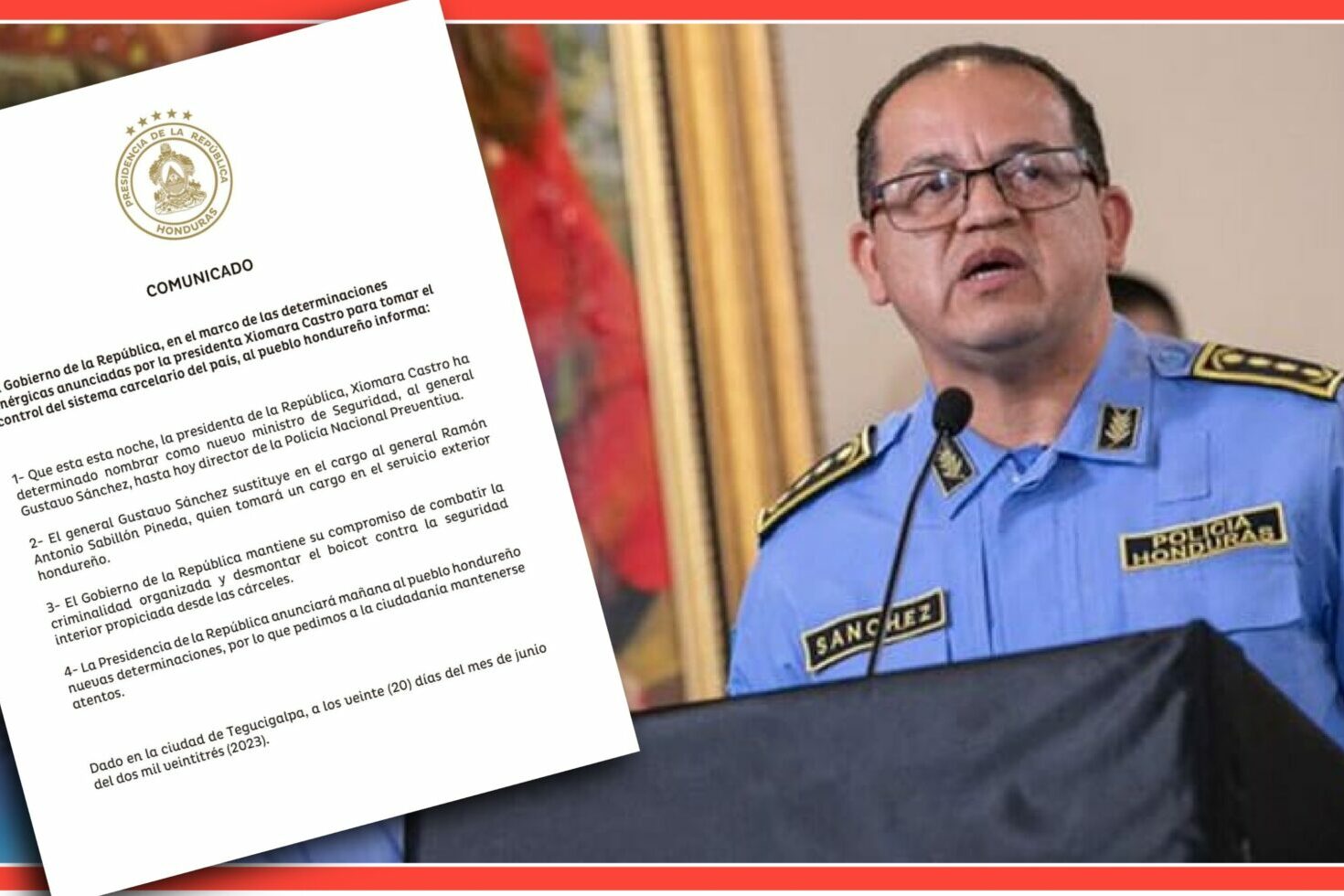El gobierno de Honduras a través de un comunicado informó este martes que la Presidenta Xiomara Castro, nombró como nuevo ministro de Seguridad al general Gustavo Sánchez, quien hasta la fecha se desempeñaba como director de la Policía Nacional.