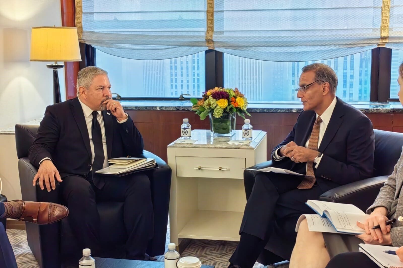 El Canciller Eduardo Enrique Reina, en compañía del Embajador de Honduras en Estados Unidos, Javier Bu, y el Asesor del Despacho Ministerial, Eduardo Rosales, sostuvieron un importante encuentro con el subsecretario de Estado de Administración y Recursos de Estados Unidos, Richard Verma, con el objetivo de abordar diversos temas como el fortalecimiento de las relaciones bilaterales entre ambos países, desarrollo económico, la protección de las instituciones democráticas, la oportunidad de asociación para el mejor manejo de la migración humana, el programa de visas temporales de trabajo y el apoyo para la instalación de la Comisión Internacional Contra la Corrupción y la Impunidad en Honduras (CICIH).