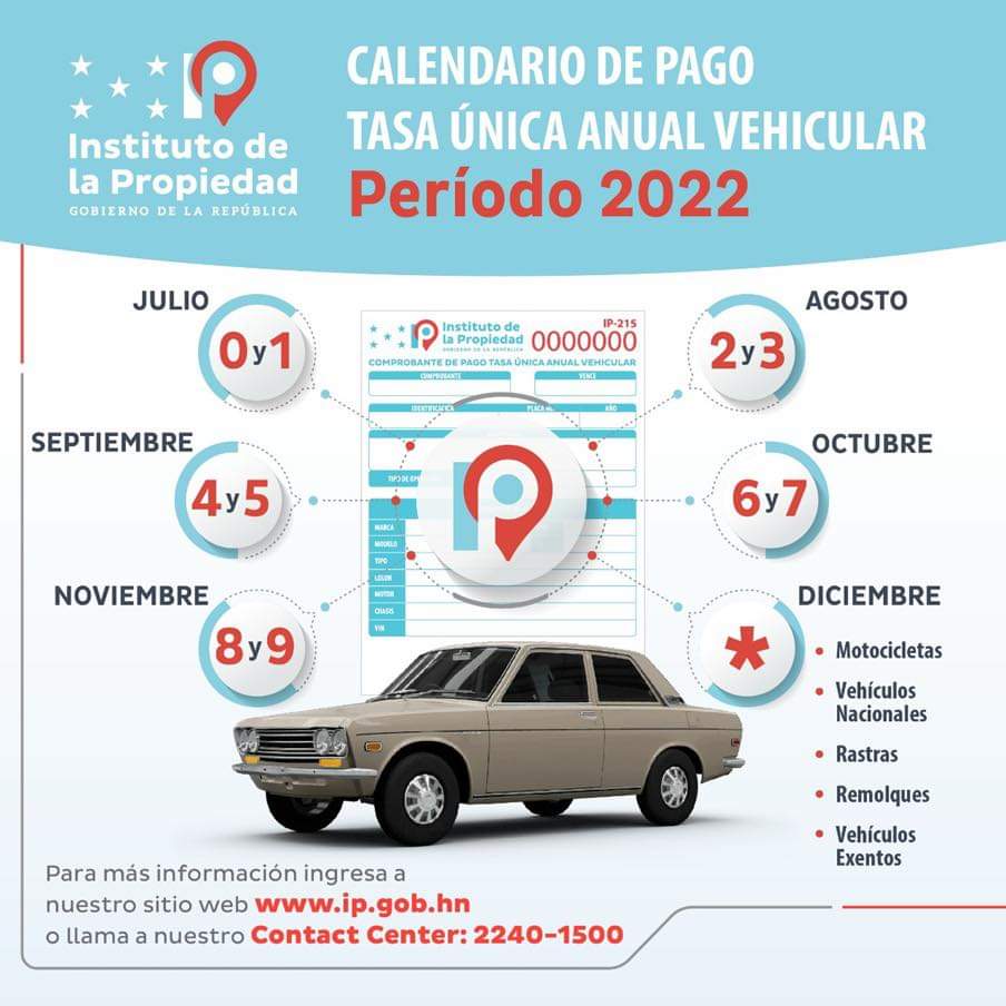 El Instituto de la Propiedad (IP), a través de la Dirección General de Registro Vehicular informa a la ciudadanía que a partir del 1 de julio inició el proceso de pago de la Tasa Única Anual Vehicular correspondiente al período 2022. El calendario oficial establece que en el mes de julio corresponde el pago de…
